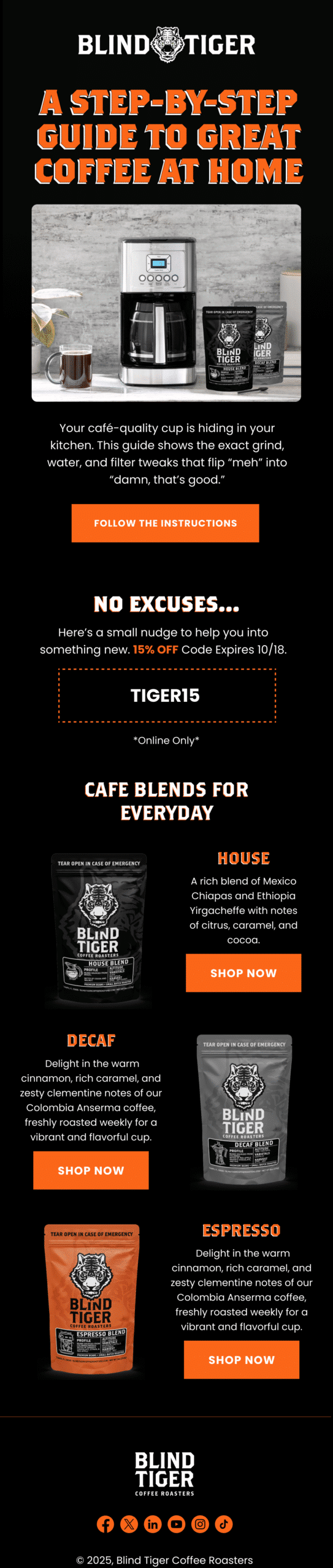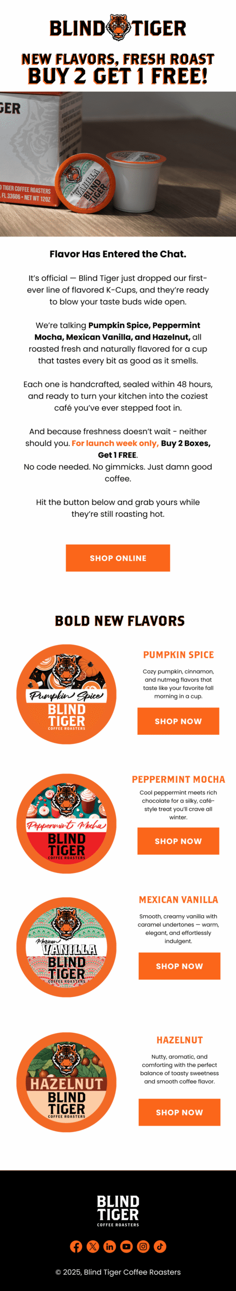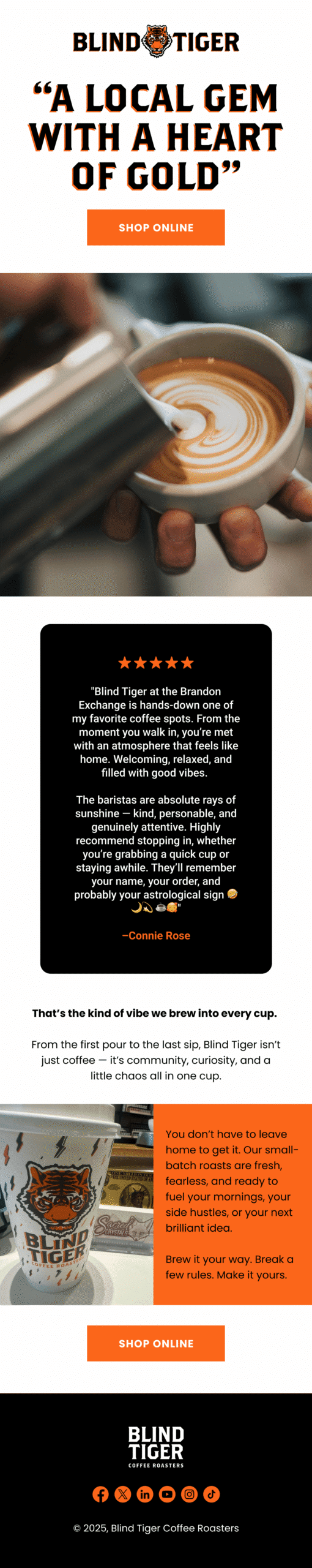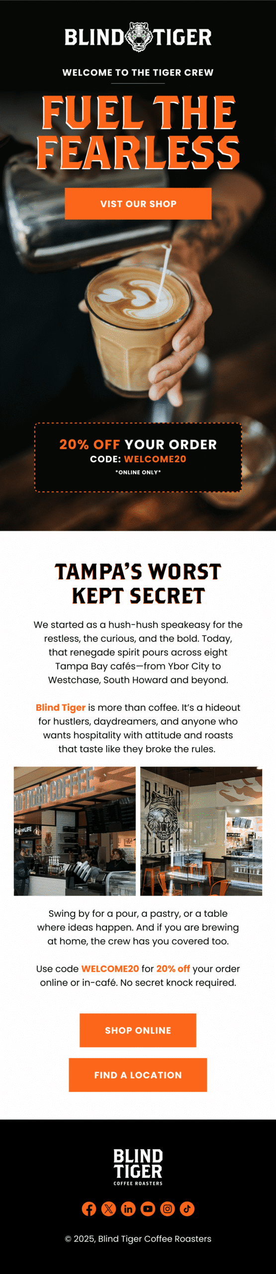 We built Blind Tiger’s Klaviyo program from scratch and turned it into a predictable revenue engine that supports both their in-store footprint and their growing e-commerce channel. Starting at zero, we engineered the full lifecycle system, including flows, segmentation, and a repeatable campaign cadence designed to move customers from first purchase to loyal regular. The real unlock was bridging offline to online: we integrated a Wi-Fi captive portal capture system directly into Klaviyo forms, so every café visit became an opportunity to grow the list and deepen the relationship. The result is a clean, deliverable, high-performing email + SMS machine that consistently drives meaningful monthly revenue without sacrificing brand feel.