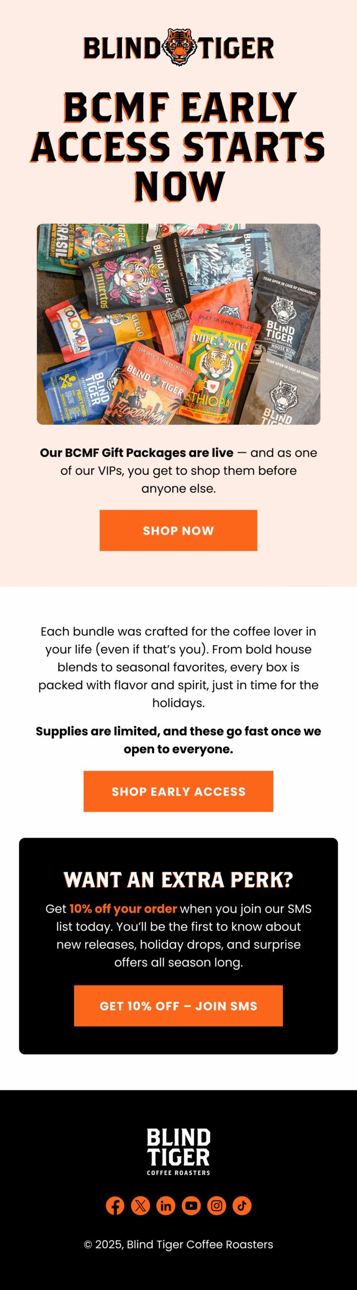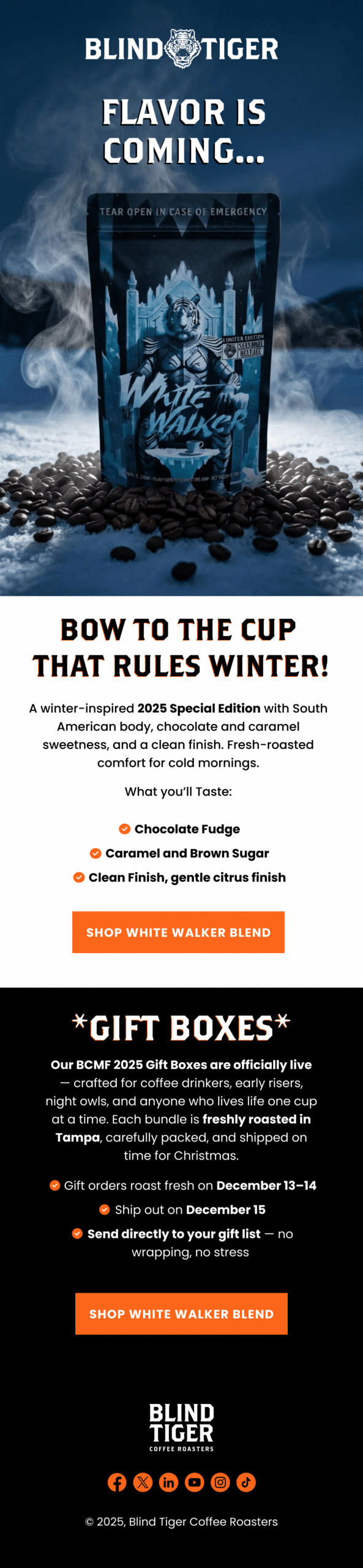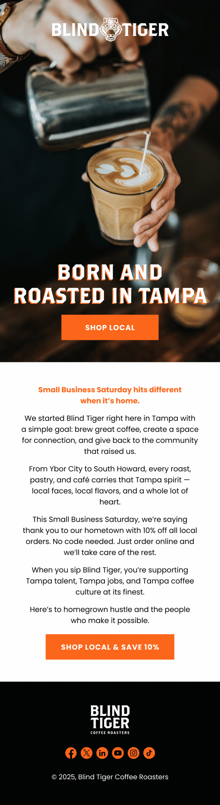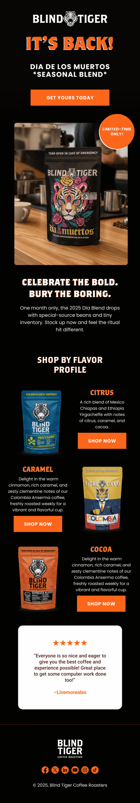 We built Blind Tiger’s Klaviyo program from scratch and turned it into a predictable revenue engine that supports both their in-store footprint and their growing e-commerce channel. Starting at zero, we engineered the full lifecycle system, including flows, segmentation, and a repeatable campaign cadence designed to move customers from first purchase to loyal regular. The real unlock was bridging offline to online: we integrated a Wi-Fi captive portal capture system directly into Klaviyo forms, so every café visit became an opportunity to grow the list and deepen the relationship. The result is a clean, deliverable, high-performing email + SMS machine that consistently drives meaningful monthly revenue without sacrificing brand feel.